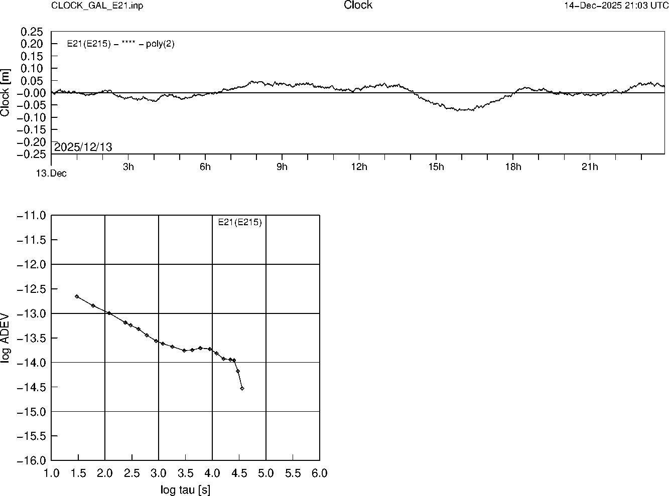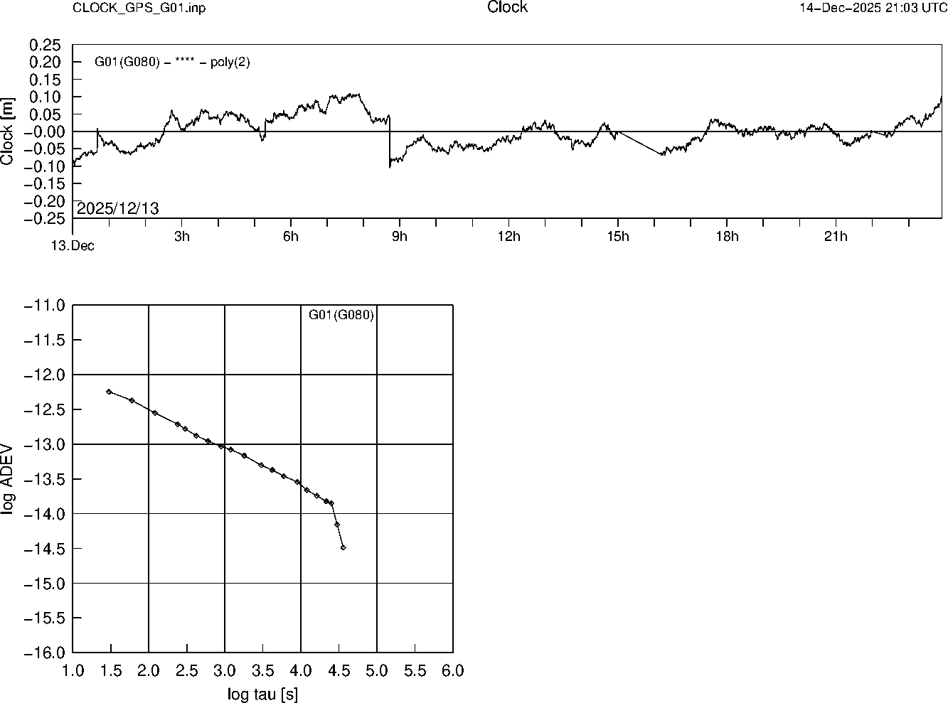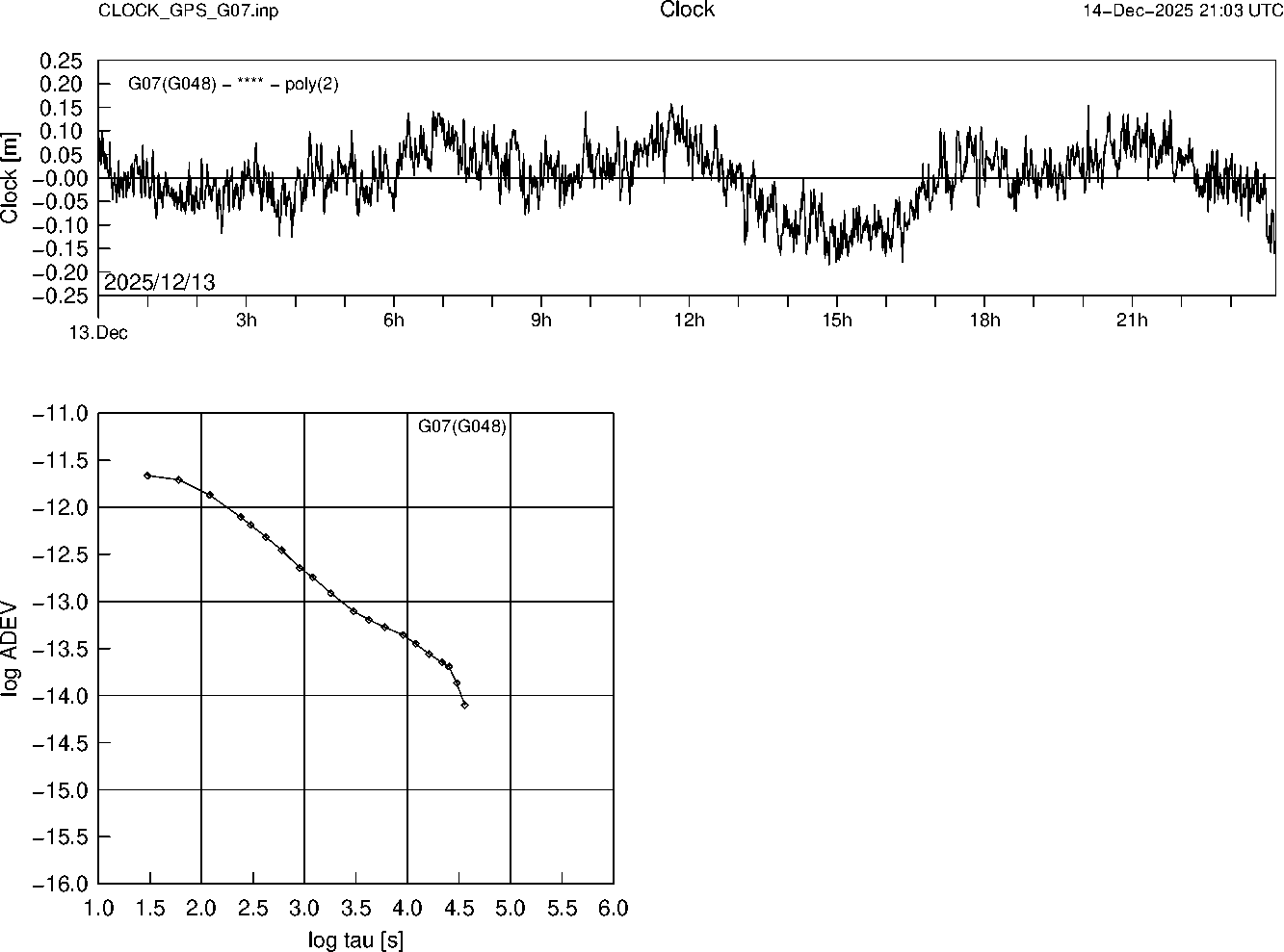 The clock time series analysis is based on 30 s clock estimates of one selected analysis center (currently GFZ0MGXRAP). Time series after removing a 2nd order polynomial as well as Allan deviation plots are shown.