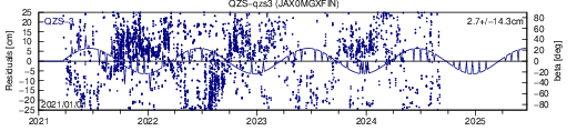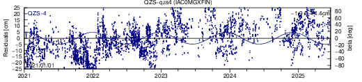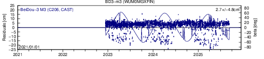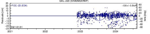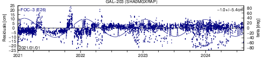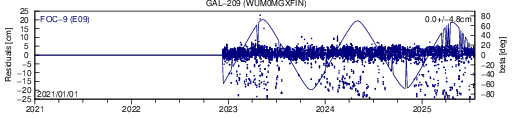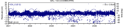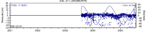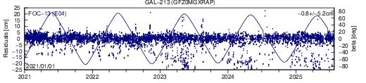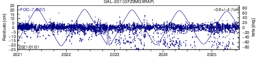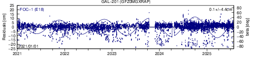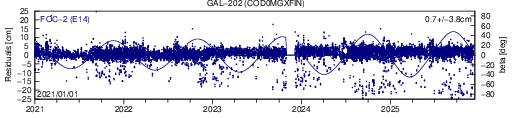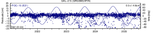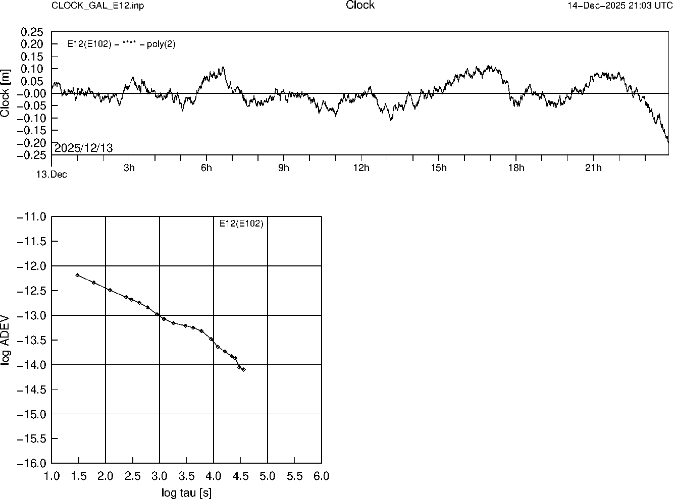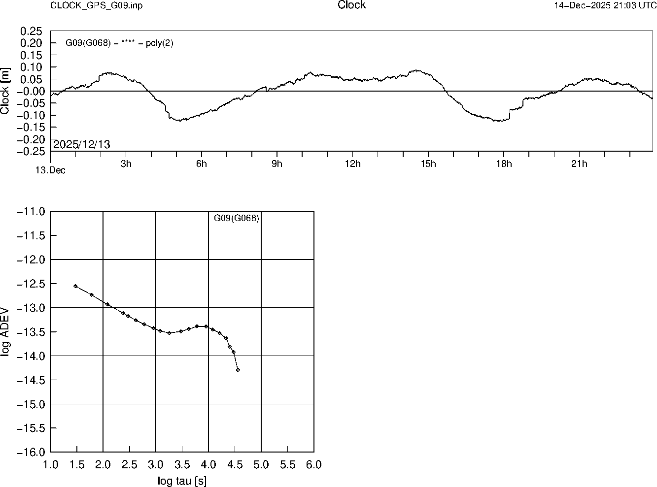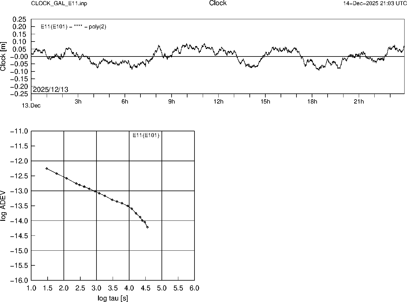 The clock time series analysis is based on 30 s clock estimates of one selected analysis center (currently GFZ0MGXRAP). Time series after removing a 2nd order polynomial as well as Allan deviation plots are shown.