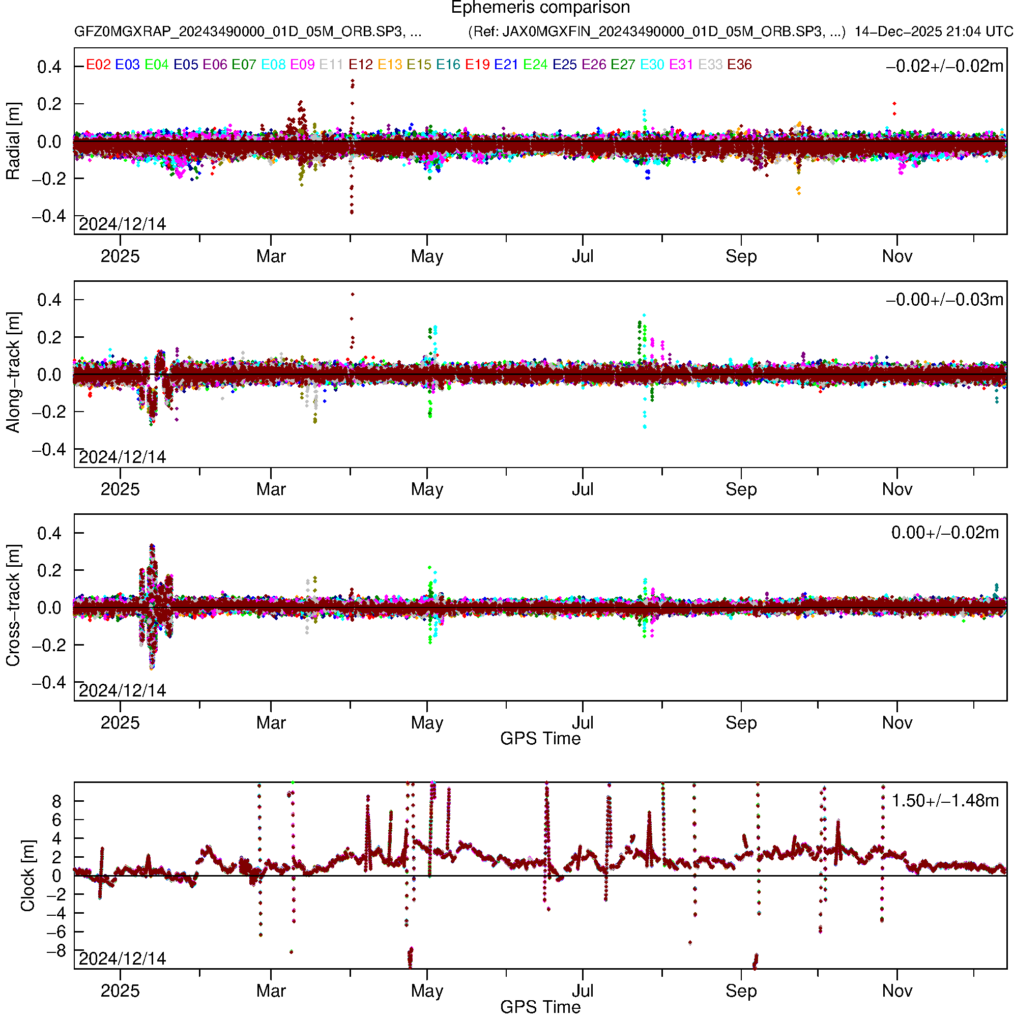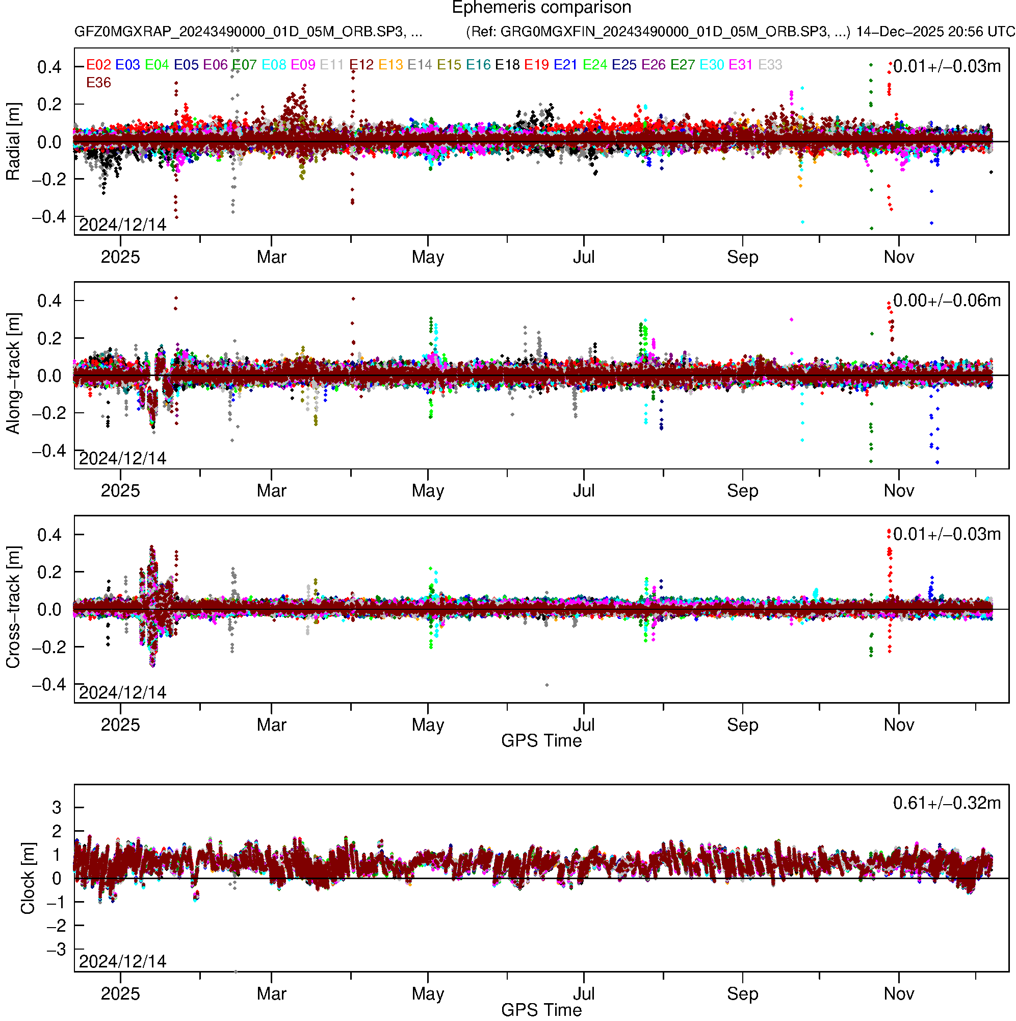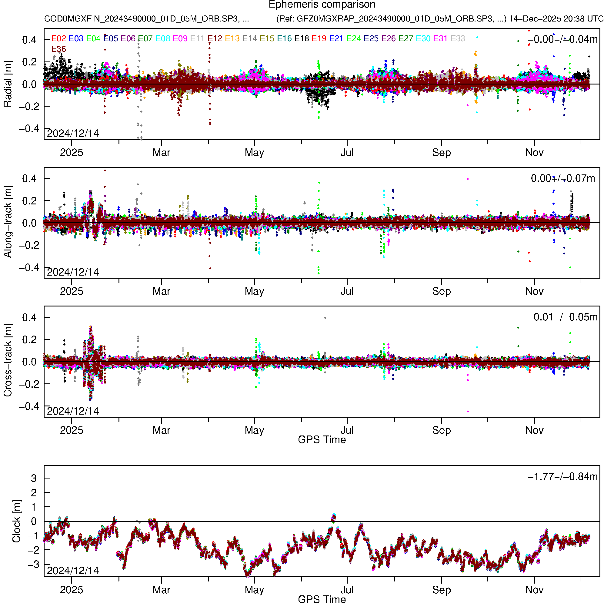 The differences of orbits and clocks for each pair of analysis centers and each constellation are shown in the following. Gross outliers exceeding 10 m are rejected. Bias and standard deviation of each component (radial, along-track, cross-track, clock) are given in the upper right of each subplot covering one year of data.