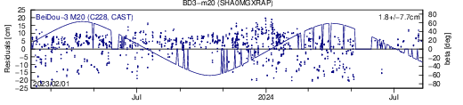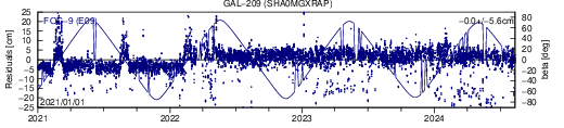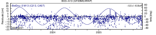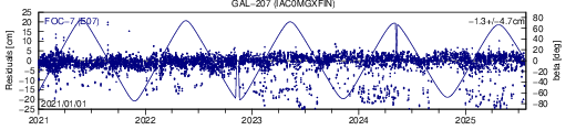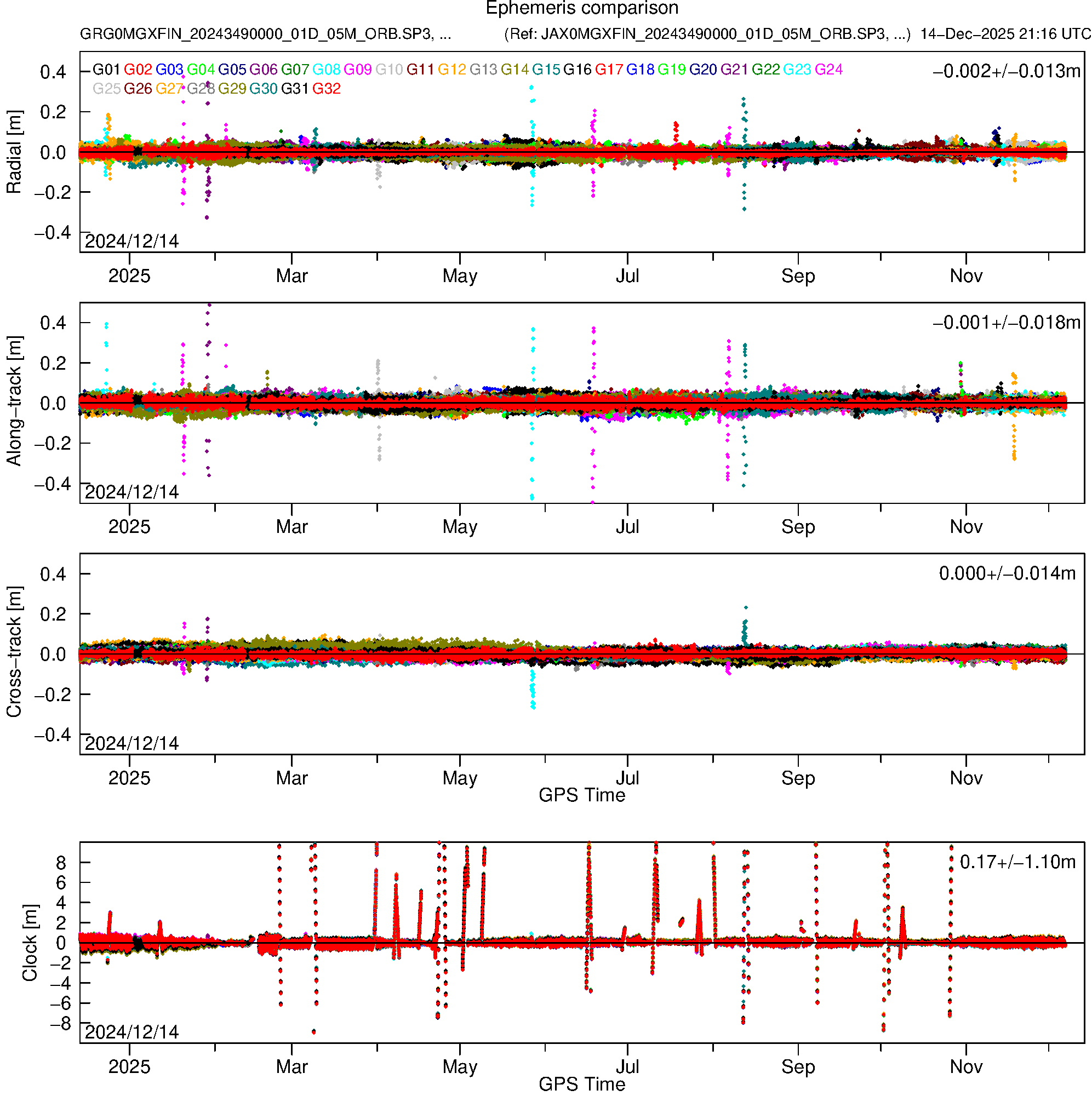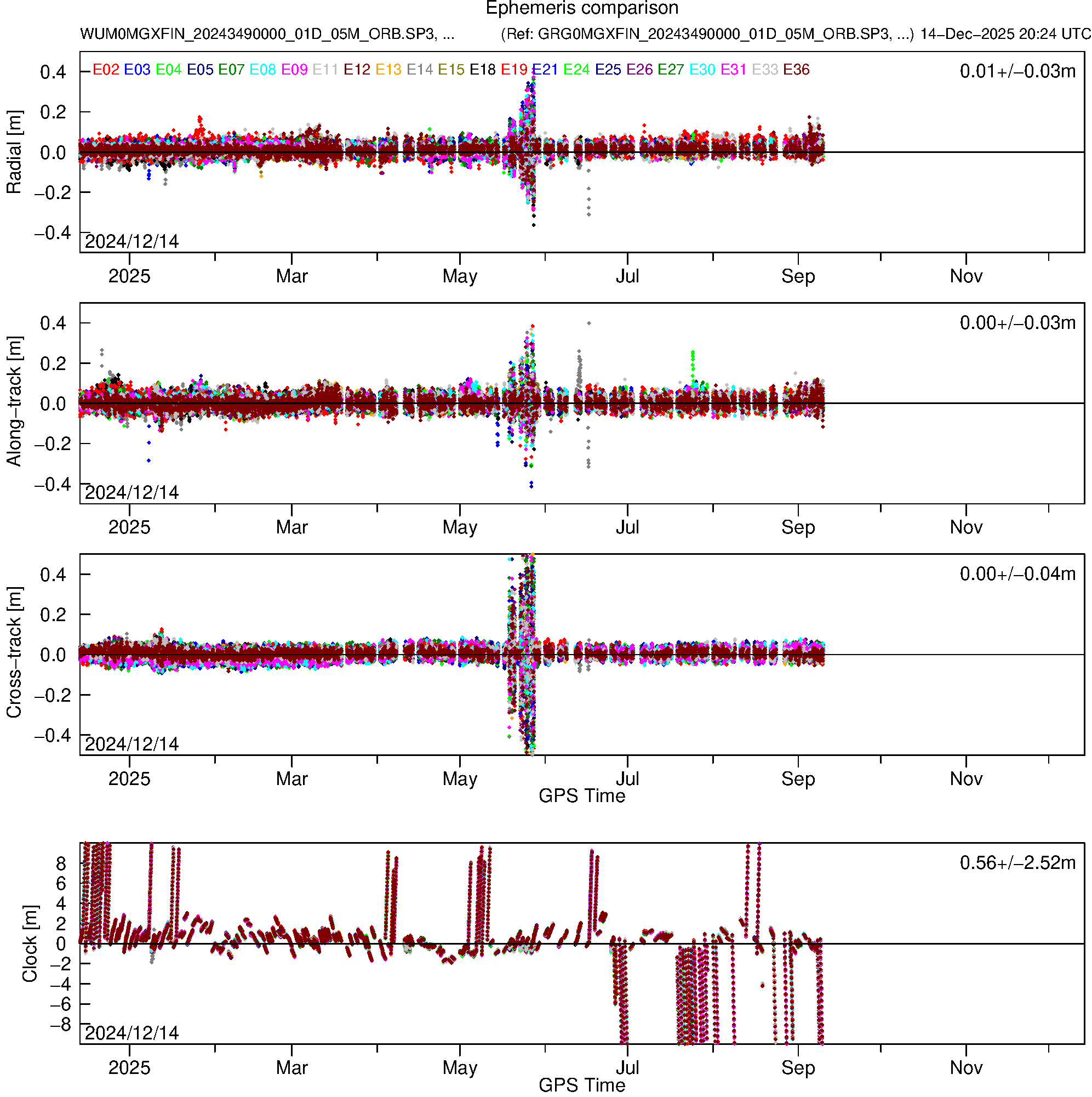 The differences of orbits and clocks for each pair of analysis centers and each constellation are shown in the following. Gross outliers exceeding 10 m are rejected. Bias and standard deviation of each component (radial, along-track, cross-track, clock) are given in the upper right of each subplot covering one year of data.